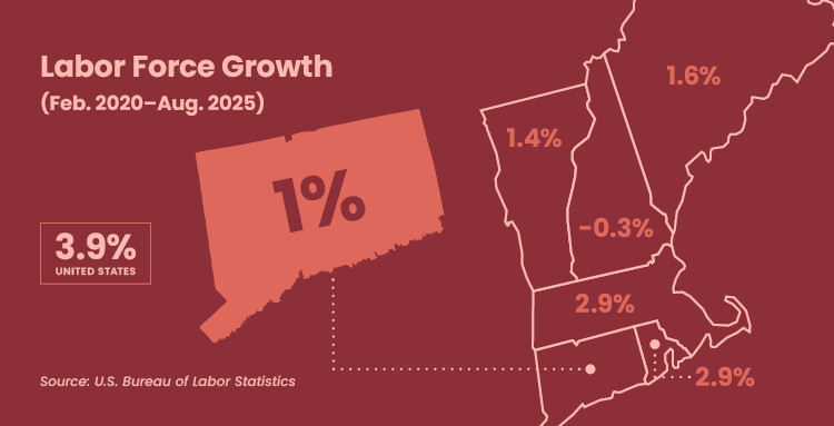 Connecticut’s labor force has grown just 1% over pre-pandemic levels, second-slowest in the region after New Hampshire, and well behind the national average of 3.9%.