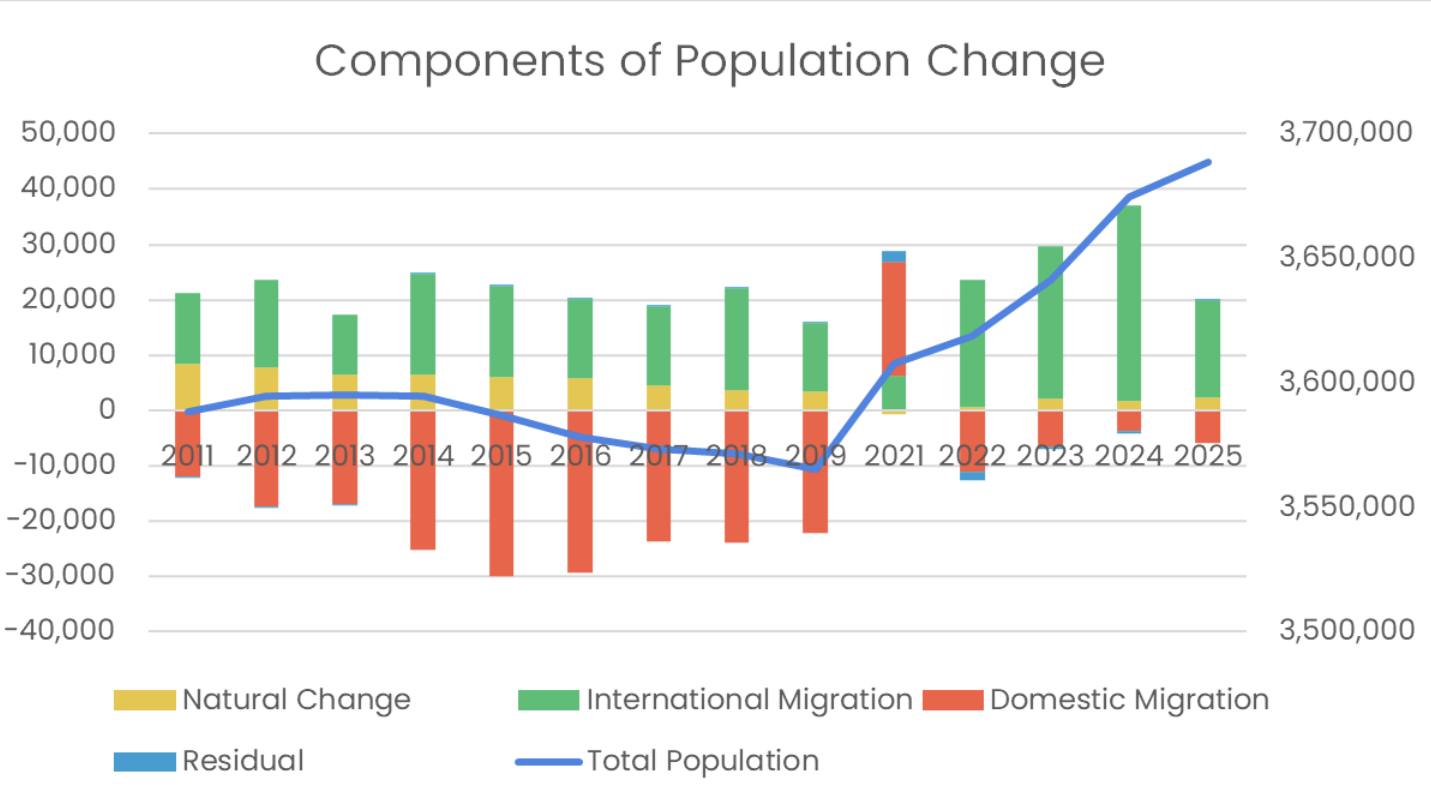 As many have felt by now, the pandemic reversed much of that trend. International migration surged to a peak of 35,456 in 2024 and averaged 28,661 per year between 2021 and 2024.