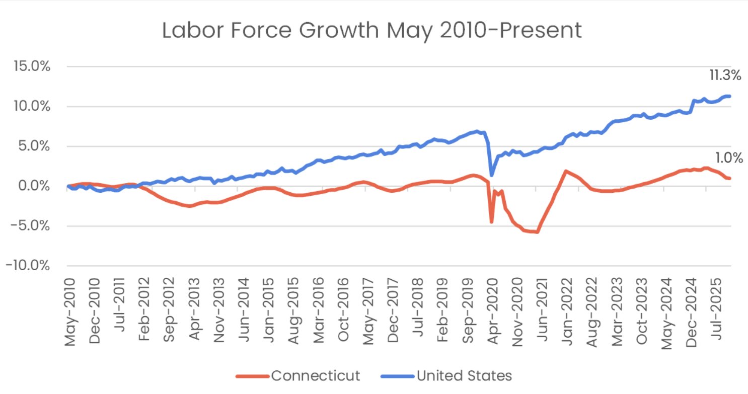 Connecticut’s civilian labor force sat at roughly 1.92 million in May 2010. By May 2025, it peaked at just 1.96 million—a gain of about 43,400 workers over 15 years. That’s roughly 2.3% growth, far below the national pace of 10.6%.