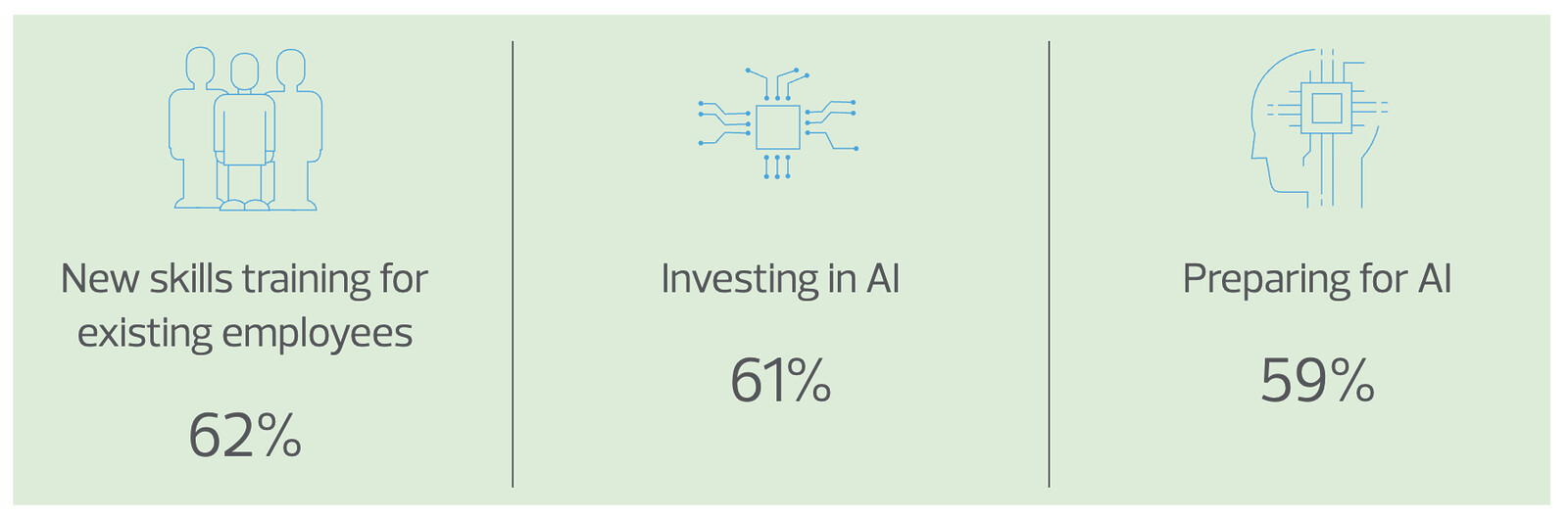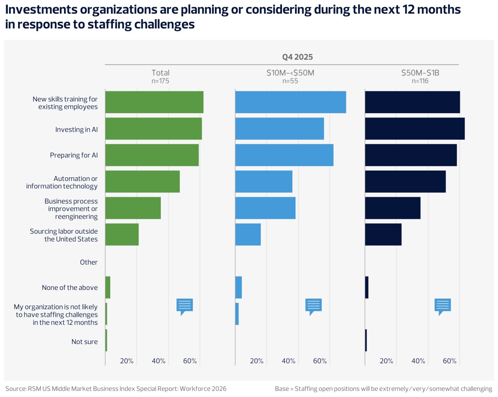 The results show that new skills training and AI investments top the list of expected workforce investments for middle market firms of all sizes.